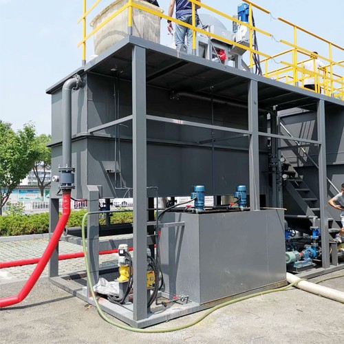 經(jīng)沉淀池沉淀下來的污泥,部分經(jīng)污泥回流泵回流到2級混合池繼續(xù)參與反應,另一部分則經(jīng)高剪切機進行污泥剝離,并進入磁分離機進行磁粉回收,回收的磁粉再次進入2級混合池繼續(xù)參與反應,剩余污泥則進入后續(xù)污泥處理系統(tǒng)。加藥間調(diào)配好的PAC和PAM溶液由加藥泵輸送至各加藥點。PAC投加到1級混合池。PAM投加到3級混合池。